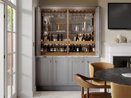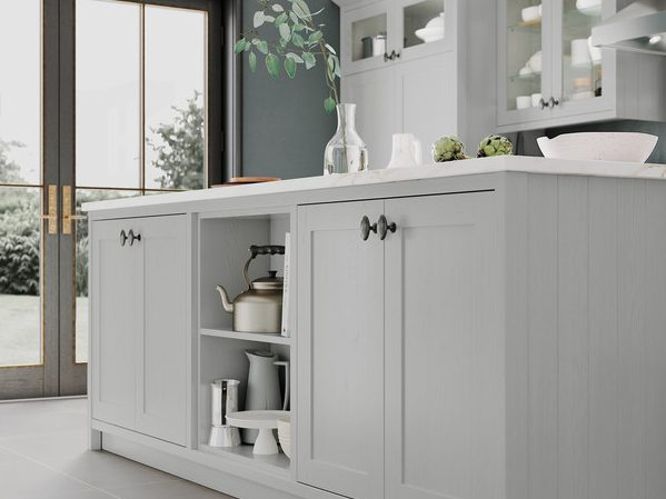 The 5-piece, solid-framed flat panel design crafted from 20mm-thick oak or ash. Its brushed painted finish enhances the depth of the grain, adding to its timeless elegance. Additionally, Colmar provides a wide range of options, including glazed doors, curved ends, and open shelving, allowing for endless customisation possibilities.