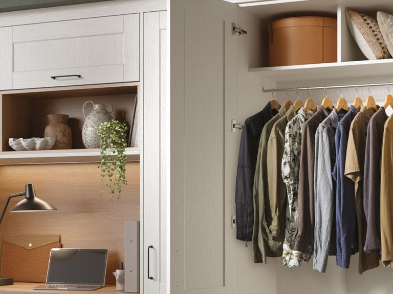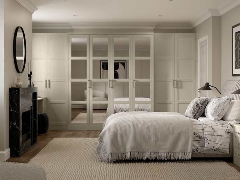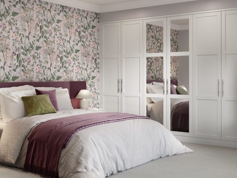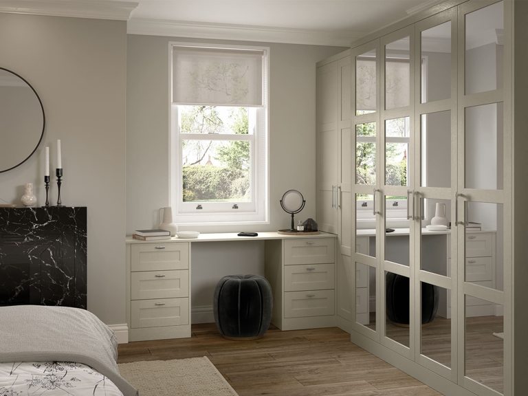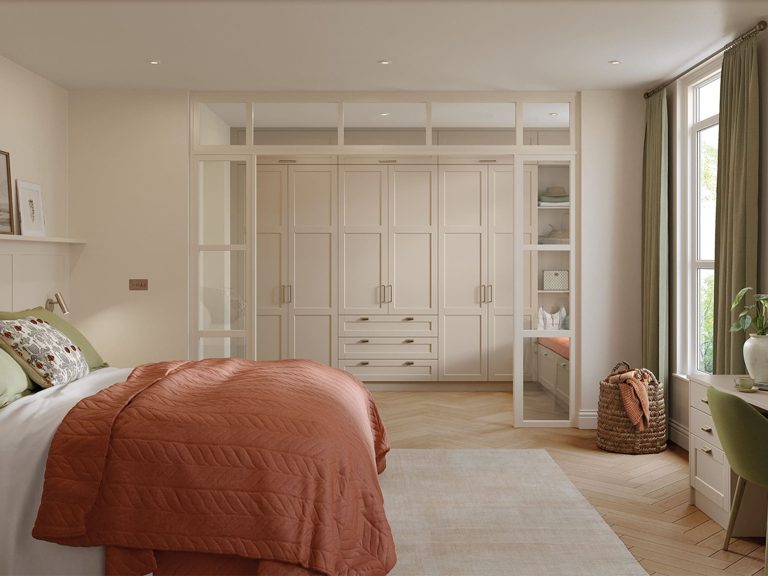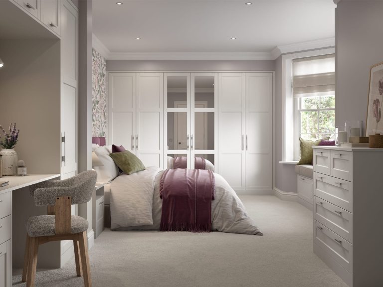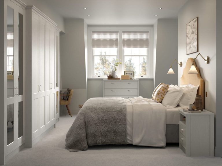 The stunning simplicity of the shaker door style fitted bedroom wardrobe is highlighted by its narrow frame. With an authentic painted woodgrain finish and a wide range of accessories, it is an ideal choice for creating both contemporary and traditional bedroom looks.