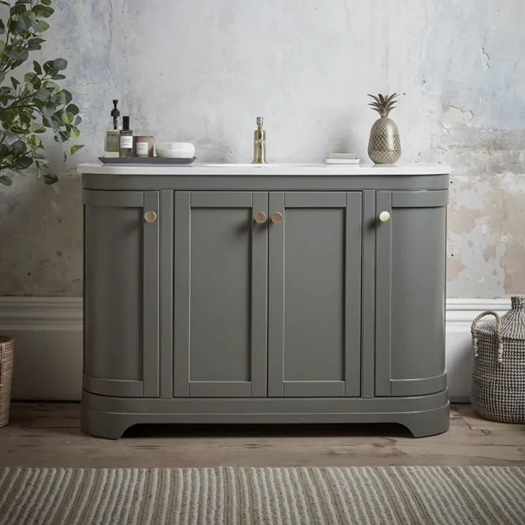 Featuring generous storage, Linea showcases a stylish, curved design complemented by meticulous fluted detailing. This finely crafted unit comes with our signature integrated basin and worktop for a seamless look.